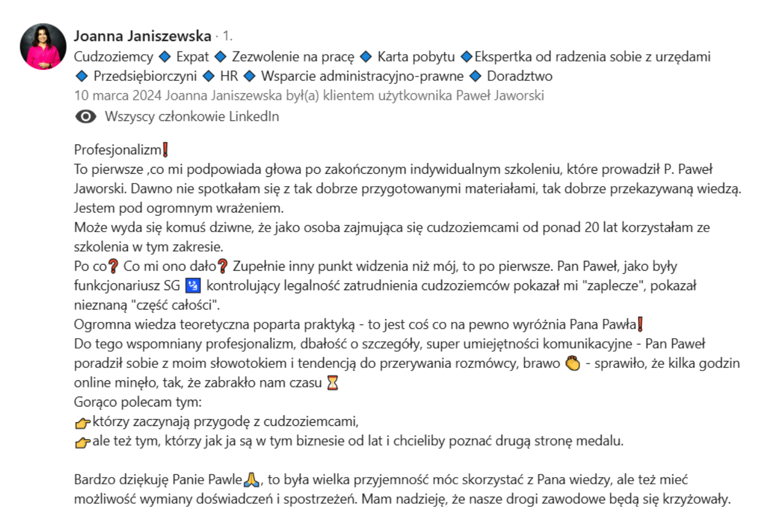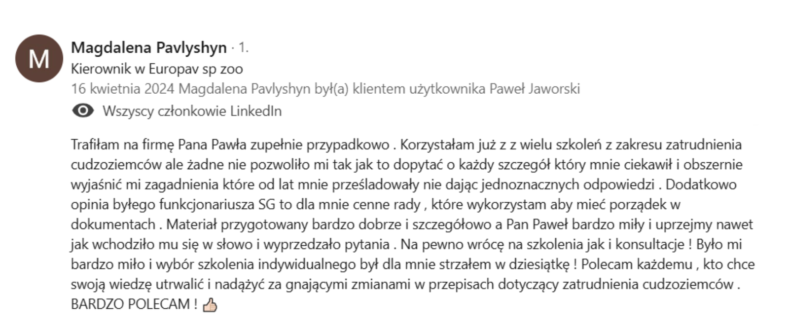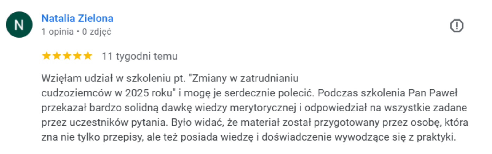 Przepisy w zakresie zatrudniania cudzoziemców w Polsce stale się zmieniają. Monitoruję zmiany na bieżąco, dzięki czemu uczestnicy moich szkoleń otrzymują rzetelną i aktualną wiedzę, która pozwoli im dostosować się do nowych regulacji, zanim te wejdą w życie.