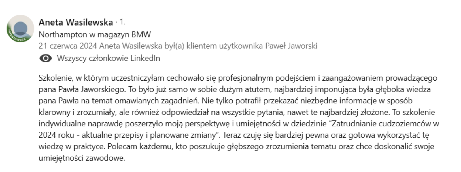 Ceni prosty język, nie prawniczy żargon, praktyczne podejście i szacunek do czasu uczestników. Jego szkolenia są zawsze aktualne, konkretne i prowadzone w przyjaznej atmosferze.